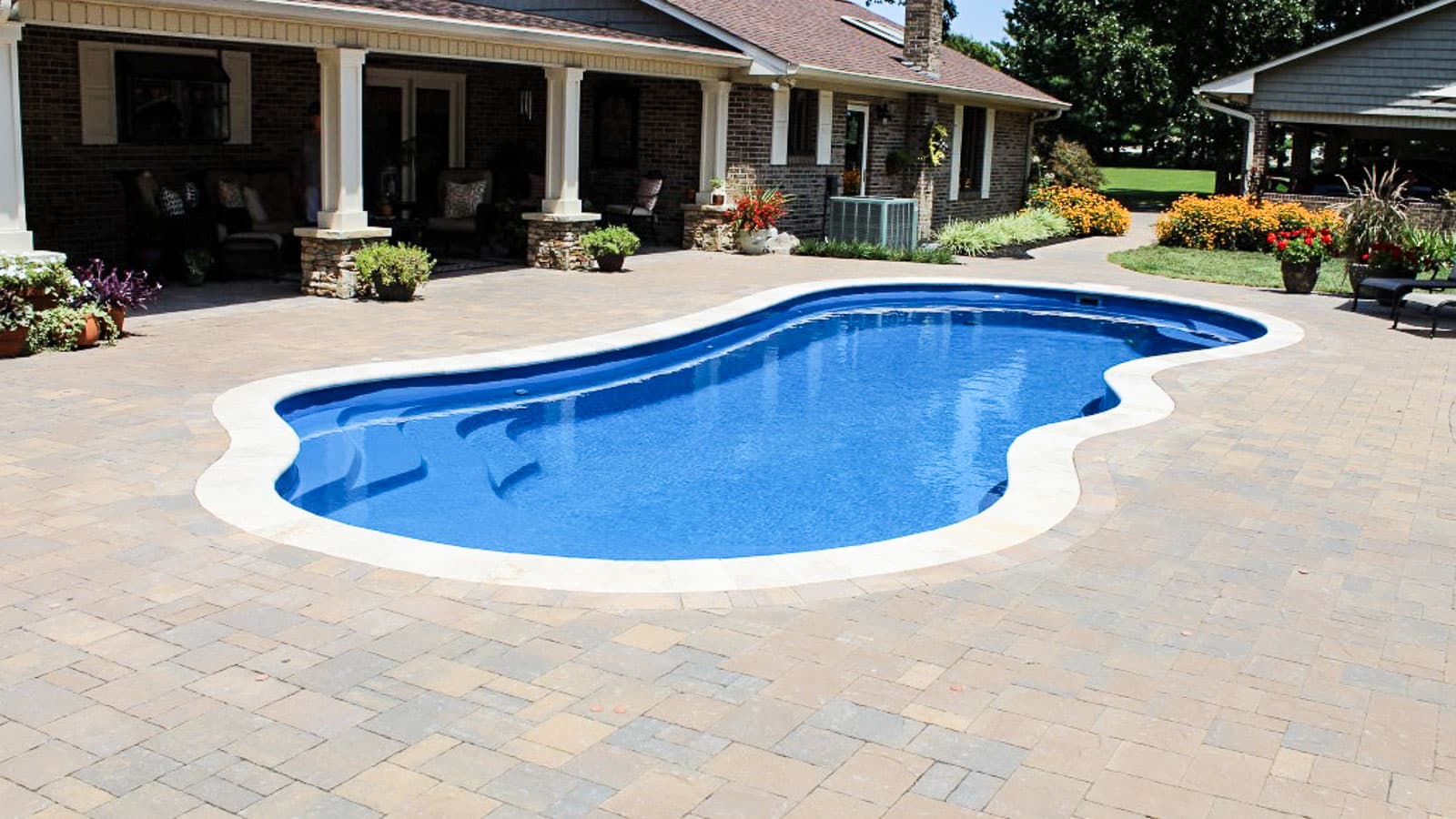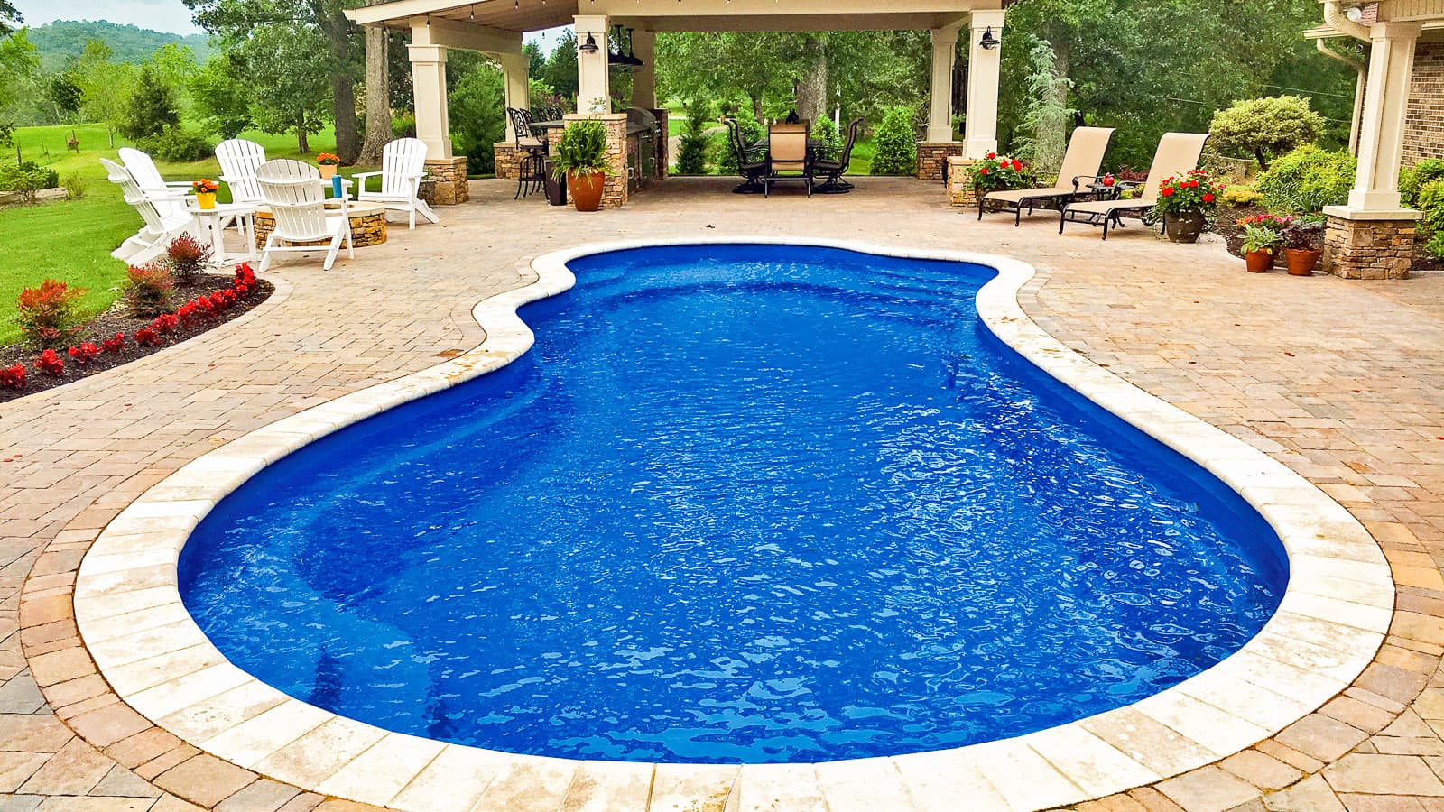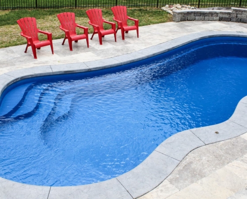 Freeform pool that offers a wraparound entry and bench at the front of the pool. Available in 3 lengths that allow you to coordinate creative landscape design with a range of swimming widths and depths.
