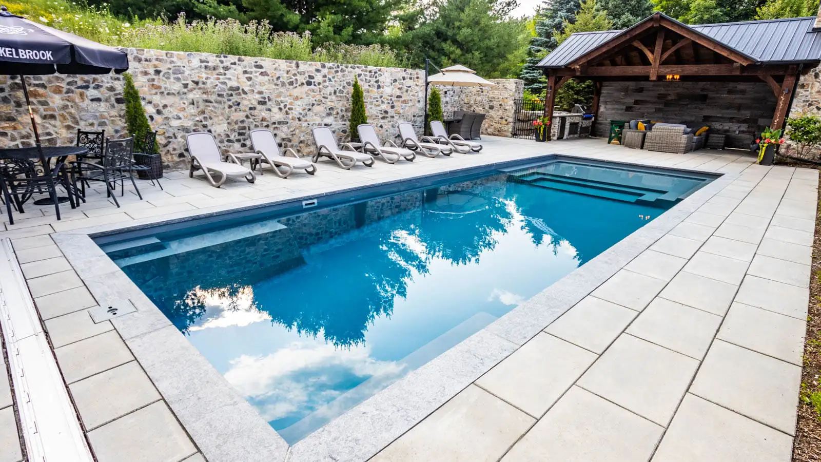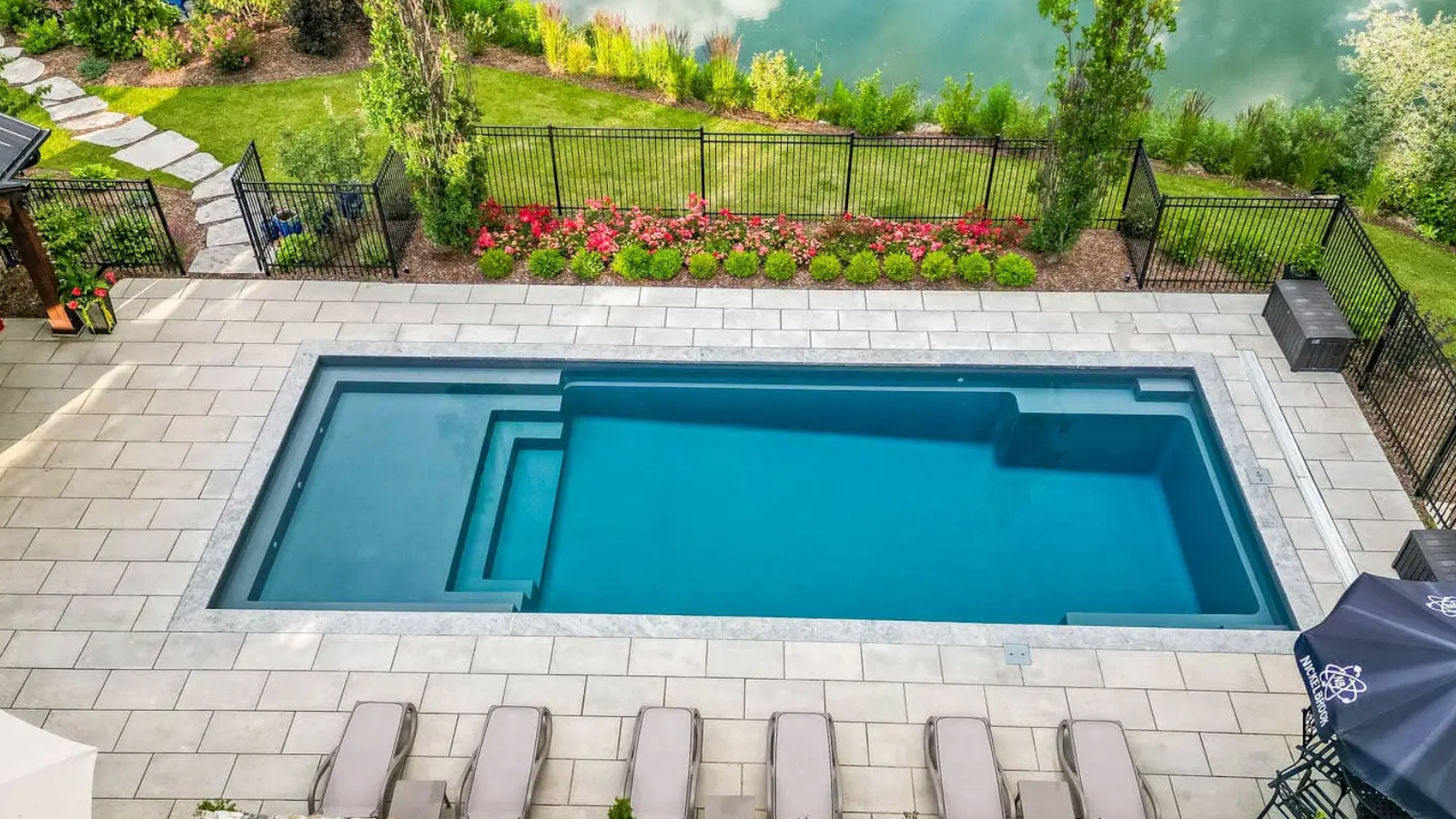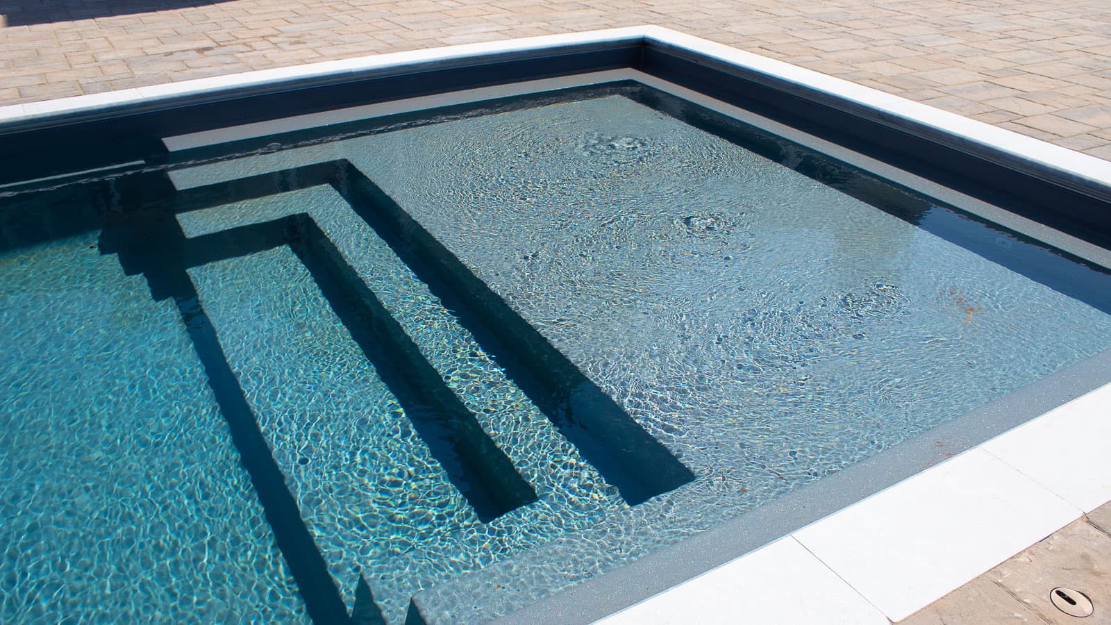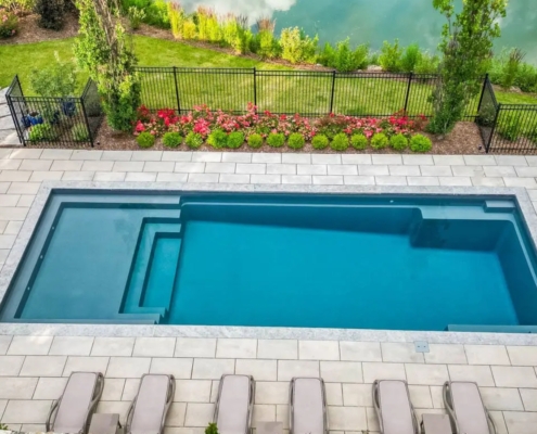 Full-width splash pad that ends with a sleek step design into a wading swimming pool. The splash pad area is a little deeper making it perfect for lounge chairs. Can descend to a full seven feet on the 40′ edition.